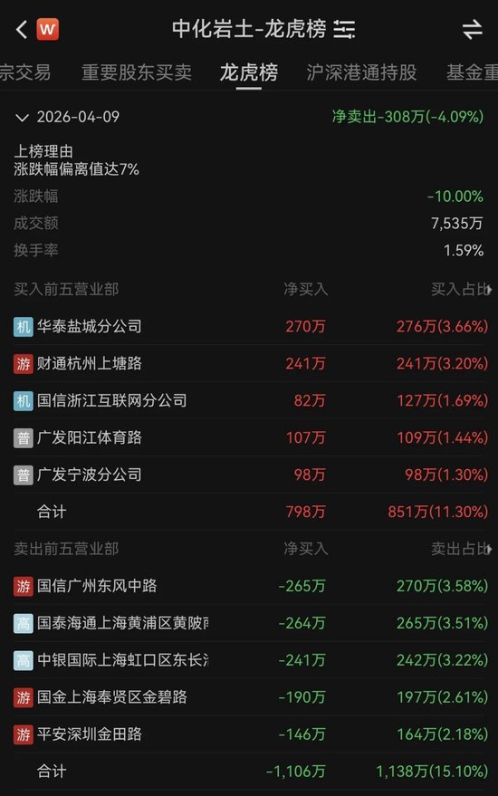 值得注意的是,在广大中小投资者逃脱无门的情况下,竟有机构和游资逆势“扫货”。中化岩土盘后龙虎榜显示,买入前五的营业部中,出现了两家机构席位和一家游资席位:机构席位方面,华泰盐城分公司席位买入276万元,位居买一;国信浙江互联网分公司买入127万元,位居买三。游资席位方面,财通杭州上塘路买入241万元,位居买二。