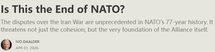美国总统特朗普在4月1日的讲话中对北约盟友在对伊冲突中的立场表达了批评。据美国广播公司的统计,北约32个成员国中,明确支持美以行动的不足16%,法国、德国、西班牙、意大利选择不合作,英国寻求加强与欧洲盟友合作,法国总统马克龙公开批评美国的不稳定行为,五角大楼在北约第五条集体防御承诺上表态模糊。前美国驻北约大使伊沃•达尔德发文称,这一轮冲突和美国对盟友信任的侵蚀,令现在“很难想象欧洲还有哪个国家相信美国会为其提供防御支持”。
