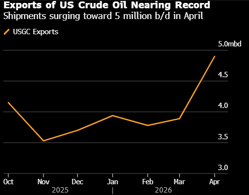 美国墨西哥湾沿岸原油日出口量5月料创纪录,达到500万桶,因亚洲买家大量采购以弥补中东供应的减少。