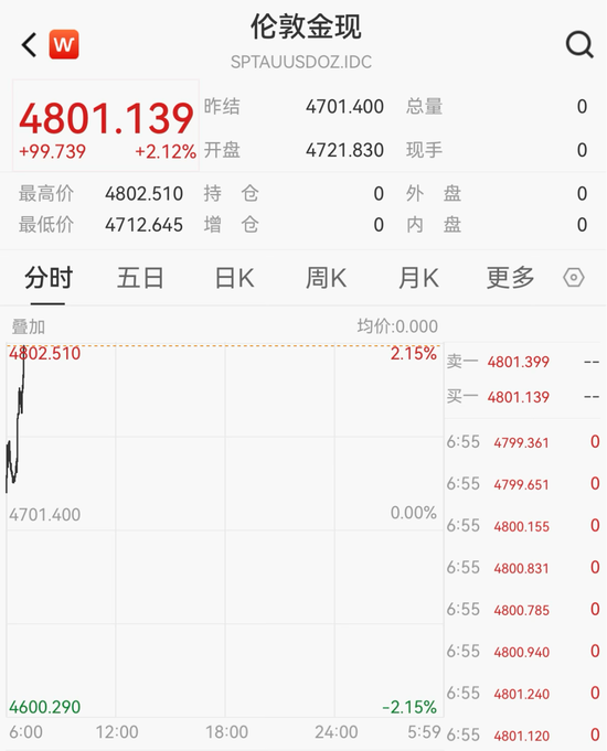 现货黄金直线上涨,突破4800美元/盎司,日内涨超2%,涨势延续。