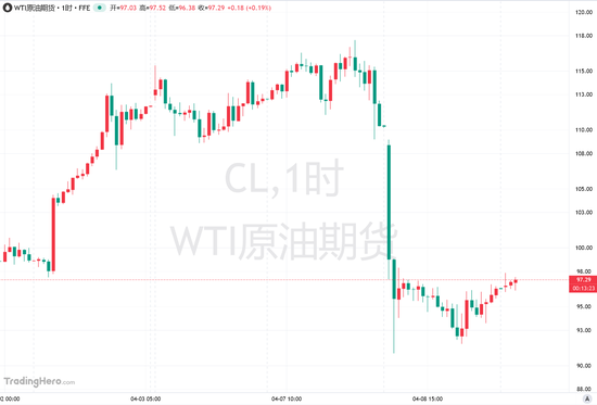 不到三小时后、即周二格林尼治标准时间约22时30分(北京时间周三早上约06:30),特朗普放弃了威胁摧毁“整个文明”的言论,宣布与伊朗达成为期两周的停火协议。此举导致周三正式交易时段开盘时,原油期货大跌约15%,跌破每桶100美元。